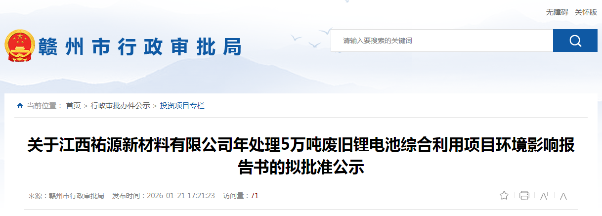 1月21日,赣州市行政审批局发布了《关于江西祐源新材料有限公司年处理5万吨废旧锂电池综合利用项目环境影响报告书的拟批准公......