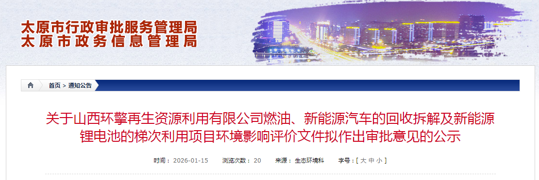 日前,太原市行政审批服务管理局发布了《关于山西环擎再生资源利用有限公司燃油、新能源汽车的回收拆解及新能源锂电池的梯次利用......