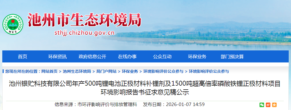 日前,池州市生态环境局发布了《池州银贮科技有限公司年产500吨锂电池正极材料补锂剂及1500吨超高倍率磷酸铁锂正极材料项......