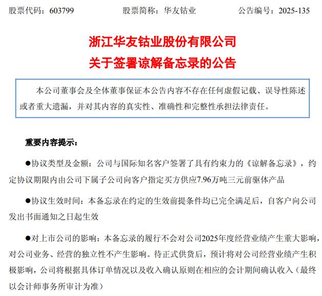 华友钴业12月16日公告,公司近期与国际知名客户签署了《谅解备忘录》,约定在协议期限内,由下属子公司向客户指定买方供应7......