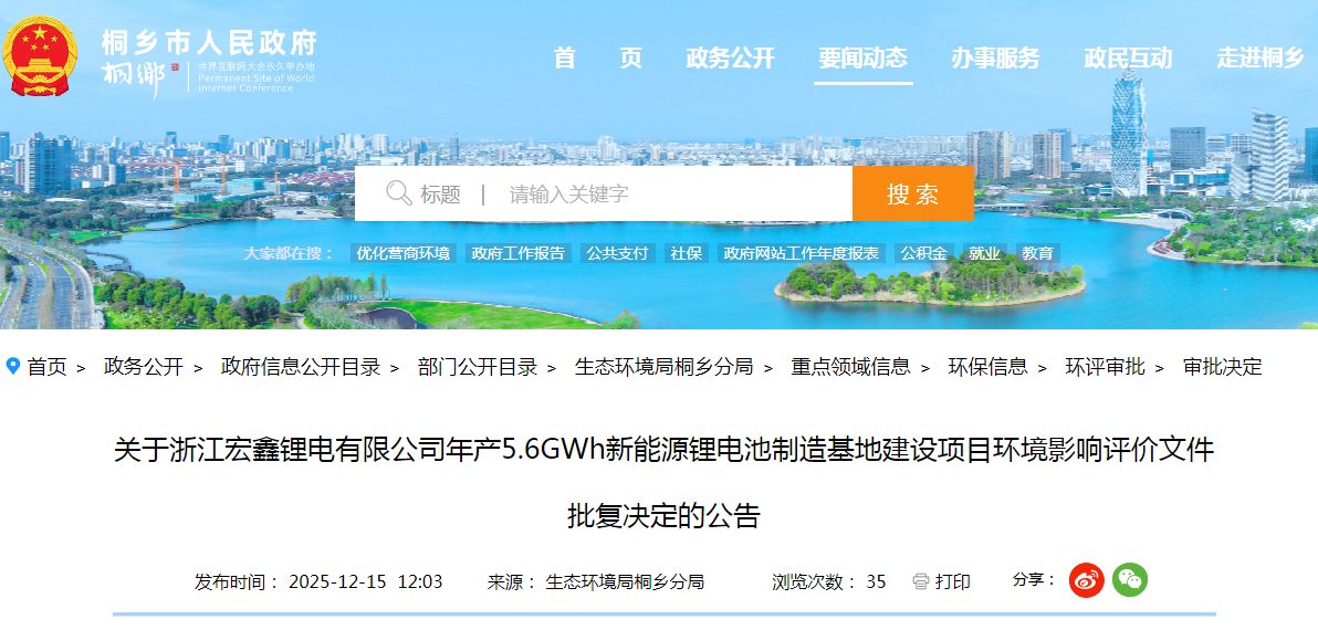 12月15日,嘉兴市生态环境局桐乡分局发布了《关于浙江宏鑫锂电有限公司年产5.6GWh新能源锂电池制造基地建设项目环境影......