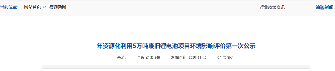 11月11日,德迦环保在其官网发布了《年资源化利用5万吨废旧锂电池项目环境影响评价第一次公示》。项目总投资11000万元......