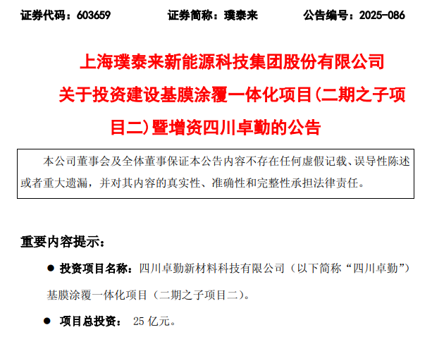 电池材料龙头企业璞泰来11月15日公告称,公司拟使用自有资金向全资子公司四川卓勤新材料科技有限公司增资7.6亿元,用于开......