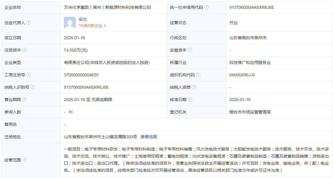 近日,万华化学集团(莱州)新能源材料科技有限公司成立。该公司注册资本7.4亿元,由万华化学(烟台)电池产业有限公司全资持......