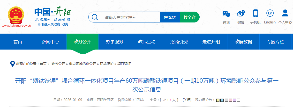 日前,贵州开阳经开区政府网站发布了《开阳“磷钛铁锂”耦合循环一体化项目年产60万吨磷酸铁锂项目(一期10万吨)环境影响公......