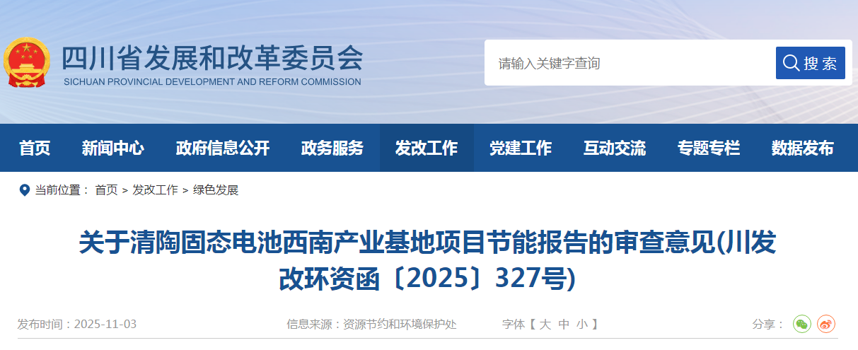日前,四川省发展和改革委员会网站披露了《关于清陶固态电池西南产业基地项目节能报告的审查意见》,该项目节能报告获原则性同意......