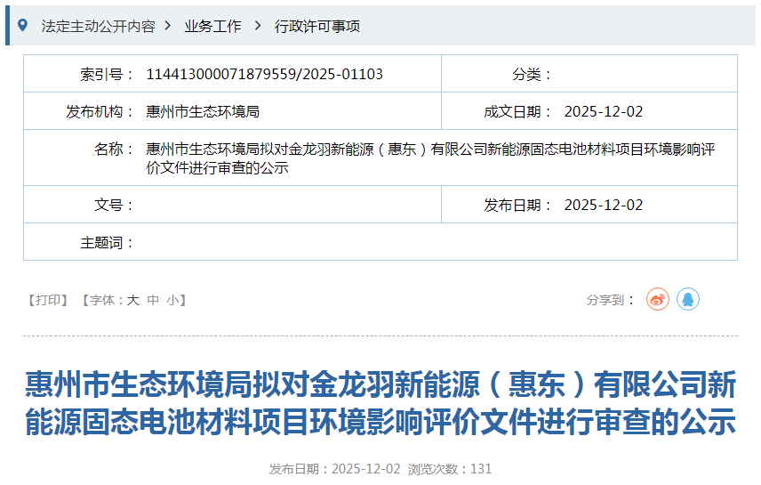 12月2日,惠州市生态环境局发布公示称,拟对金龙羽新能源(惠东)有限公司新能源固态电池材料项目环境影响评价文件进行审查。......