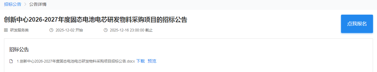 吉利电子招标平台日前发布了《创新中心2026-2027年度固态电池电芯研发物料采购项目招标公告》,招标人为浙江绿色智行科......