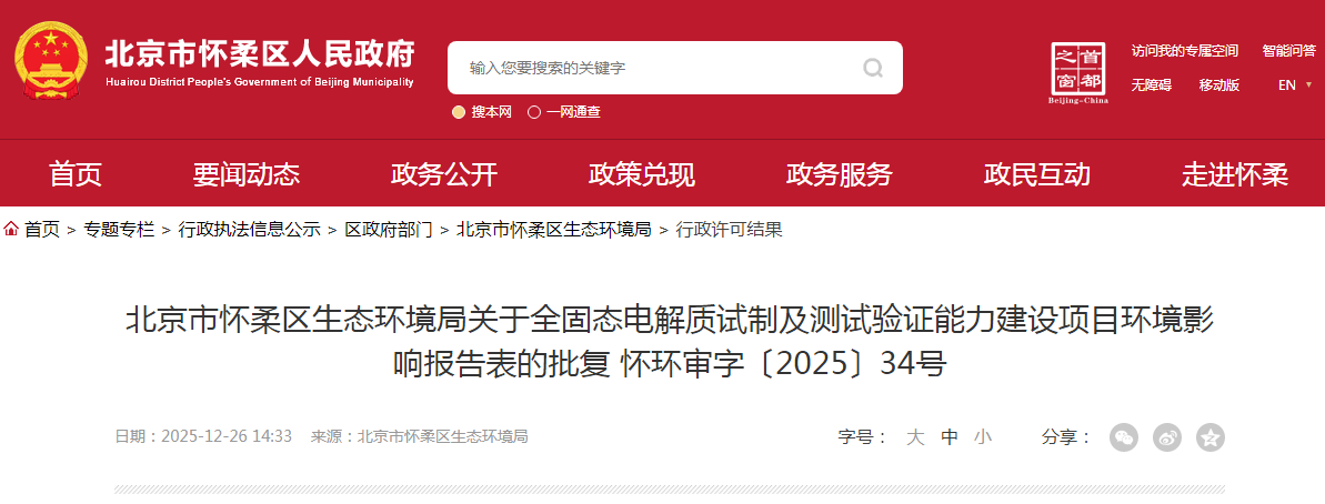12月26日,北京市怀柔区生态环境局发布公告,《全固态电解质试制及测试验证能力建设项目环境影响报告表》获得批复。项目建设......